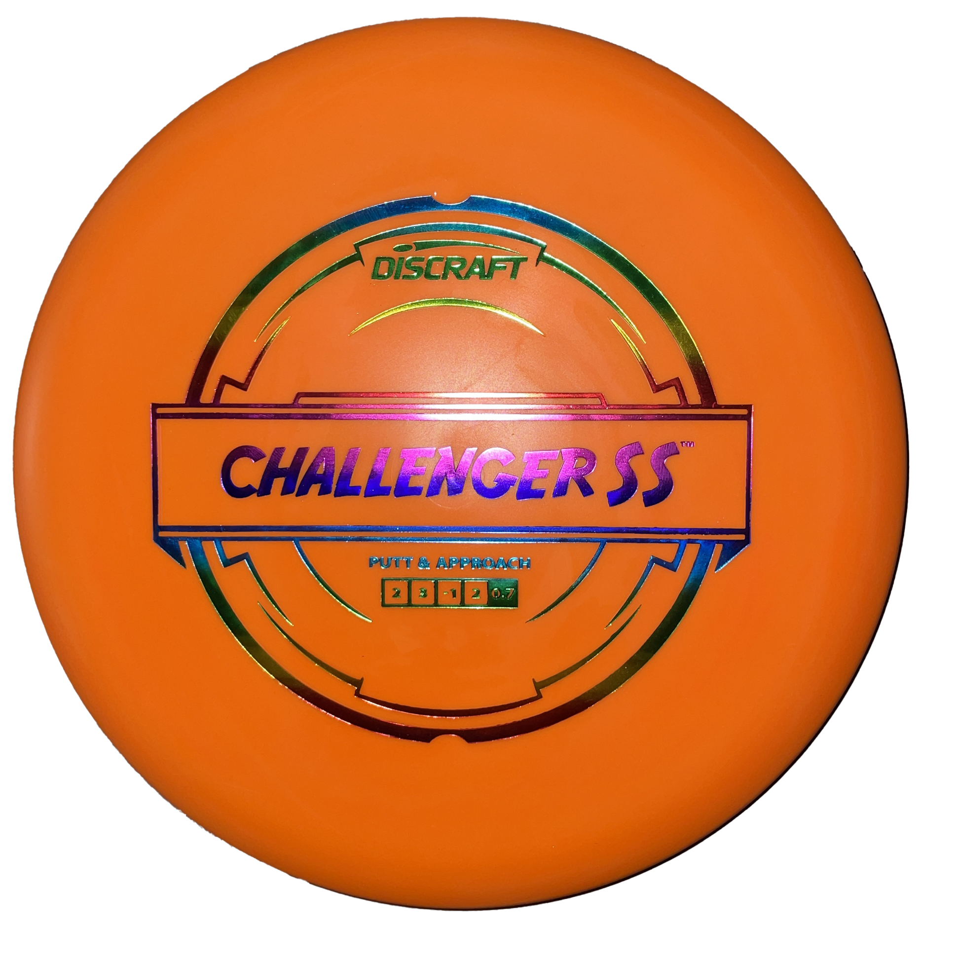 The Challenger SS is a putter originally debuted as a "Test Flight" disc during the 2017 Ledgestone Open. It is a more understable version of the popular Challenger putter, with a flat-top and rounded edge and comfortable grip.